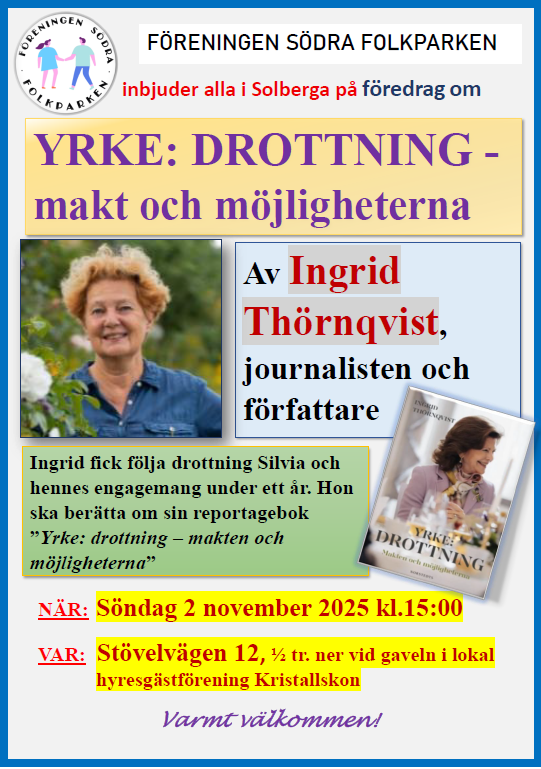 Nu är det dags igen denna gång Föreläsning 2 november 15.00, Stövelvägen 12, yrke Drottning, klicka på länken så ser du affischen.